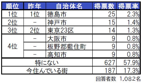 住みたい街1位は4年連続で徳島市。2位神戸市、3位東京23区。