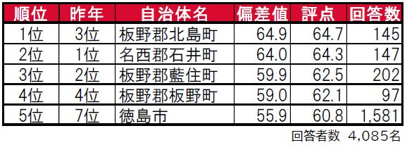 4年連続で、徳島市が1位に輝きました。2位は初ランクインの神戸市、3位は東京23区です。4位には、板野郡藍住町と、県外から大阪市と高知市の3自治体が新たにランクインしています。