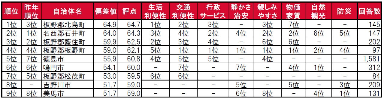 街の住みここちランキング2023<徳島県版>自治体TOP9 因子別順位
