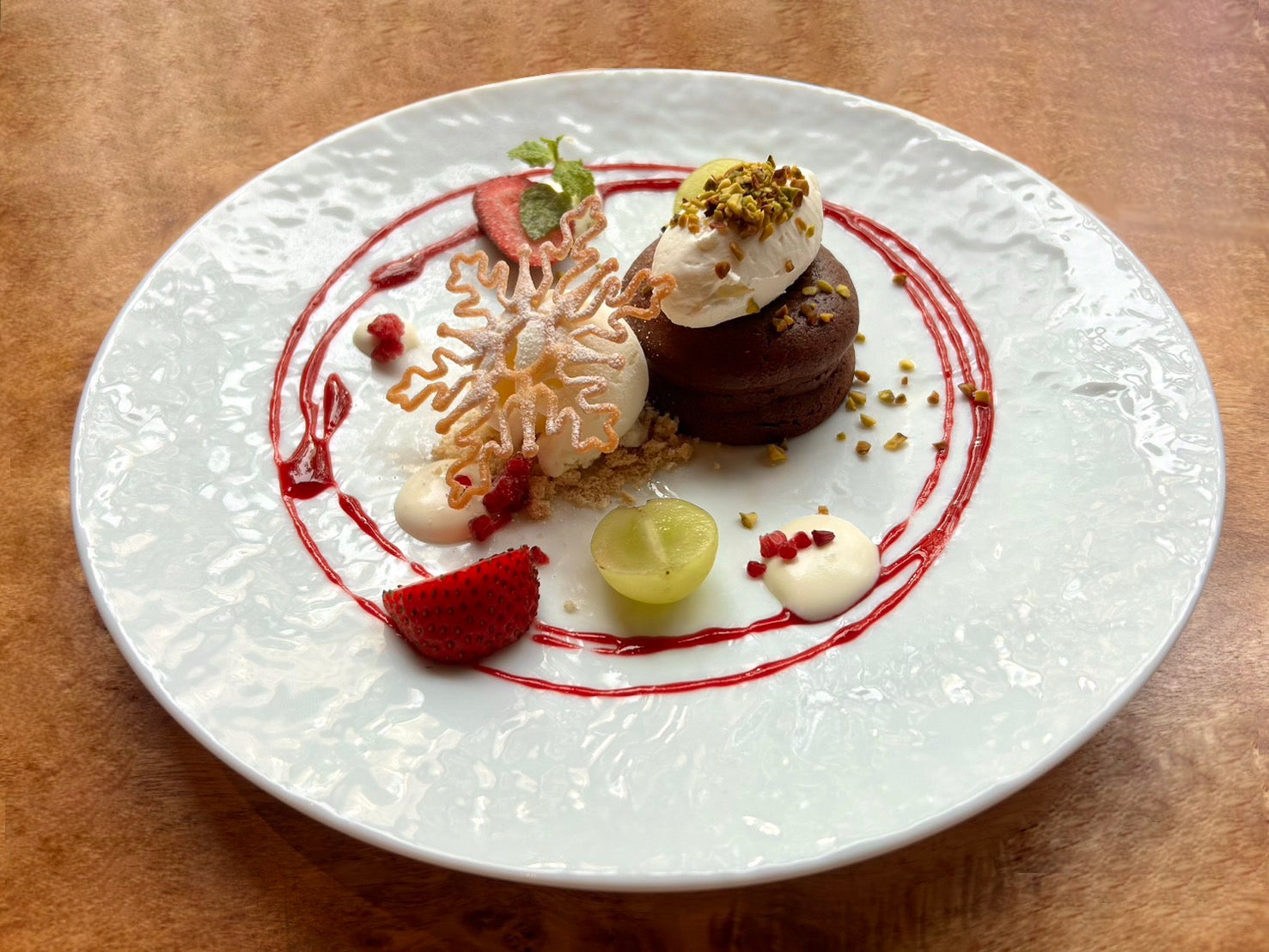 あたたかいショコラの生地から溢れるたっぷりのナッツ入りチョコと、白ワイン&クリームチーズのクリームをぜひご一緒にご賞味ください。