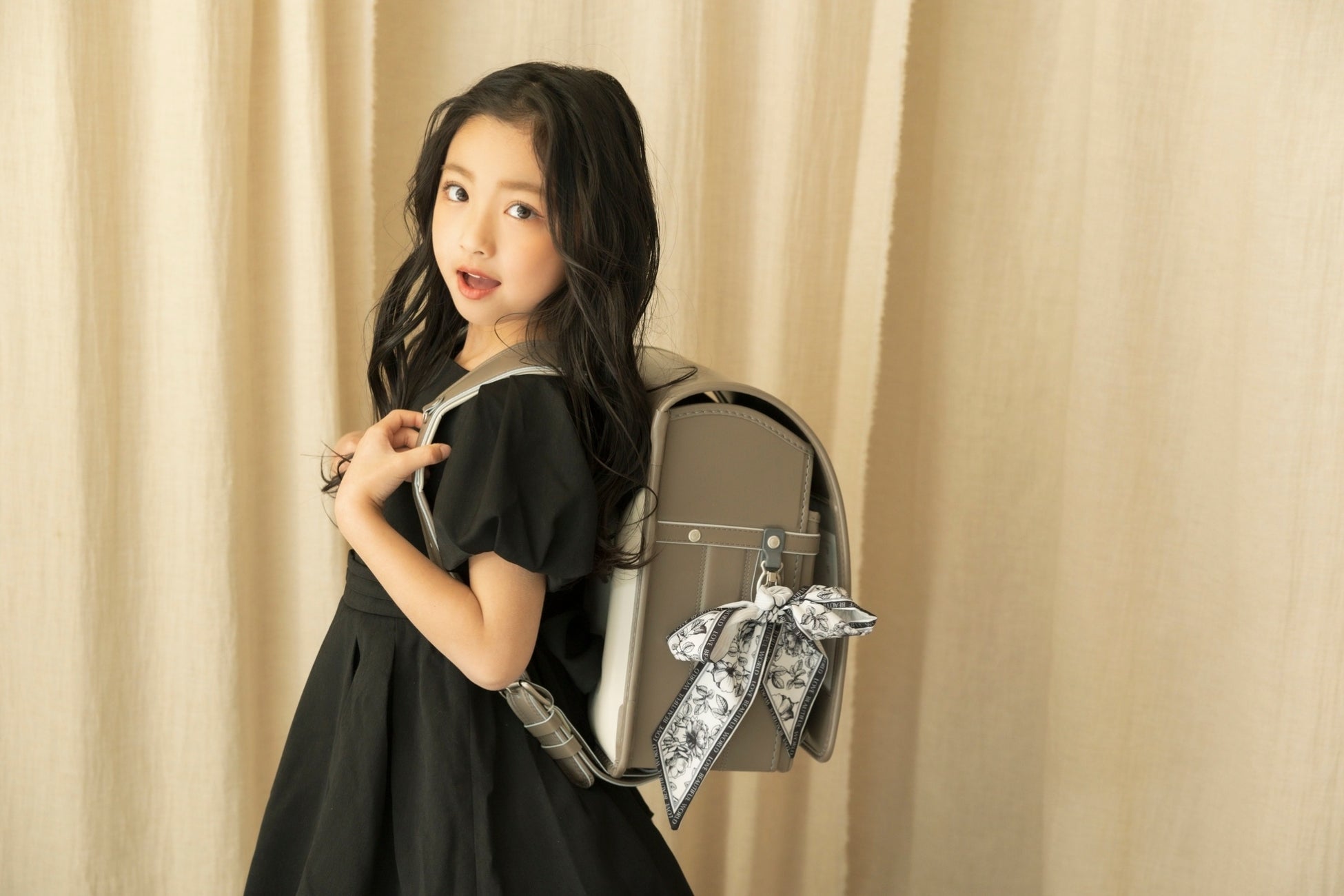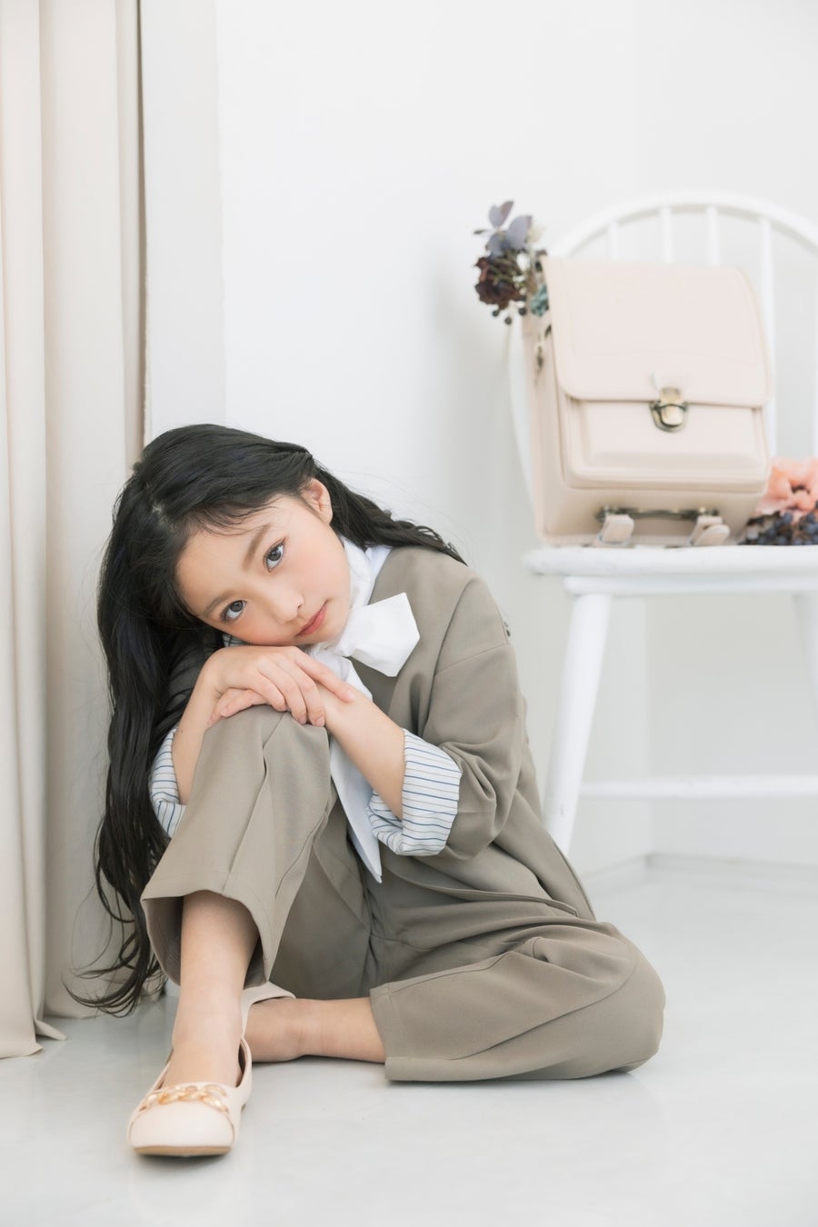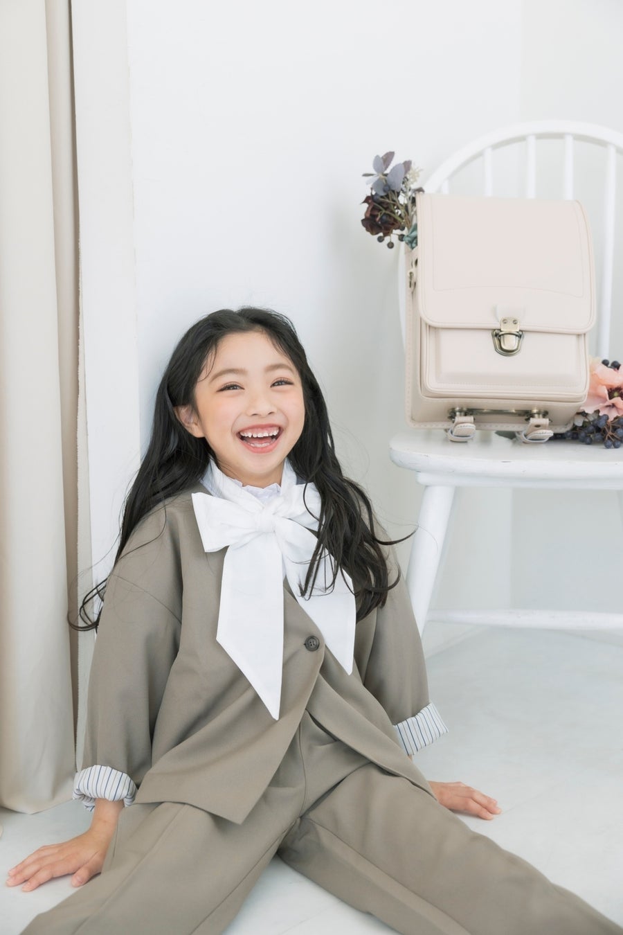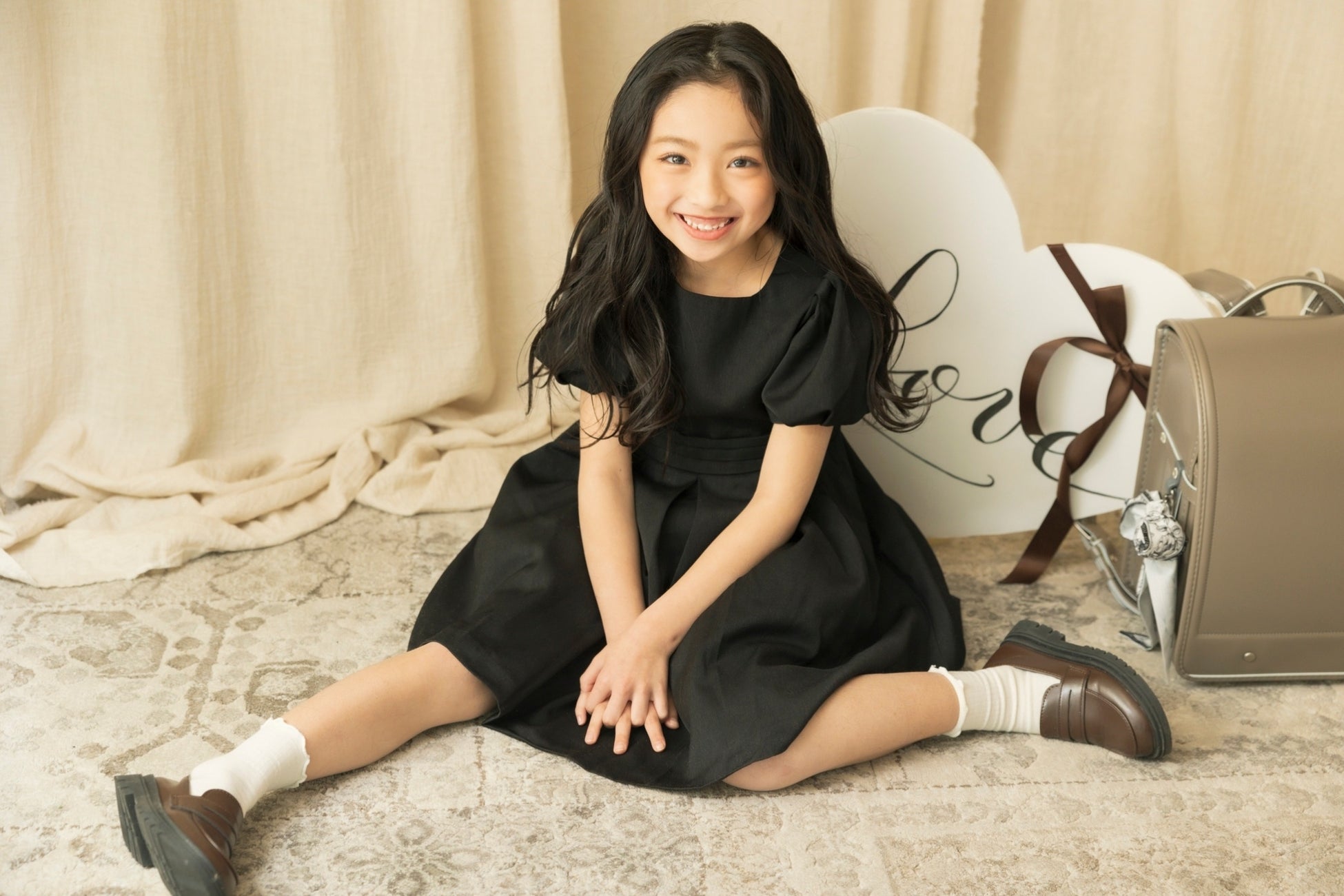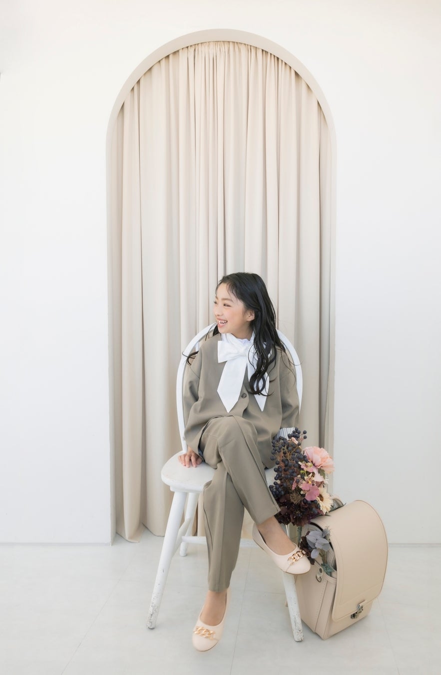 入学式本番の女の子衣装は「フォーマルなワンピース」が定番ですが、前撮りや後撮りならではのスタイリングのご提案。“大人っぽいのに、どこかキュート”バランスが絶妙なNEW STYLINGです。