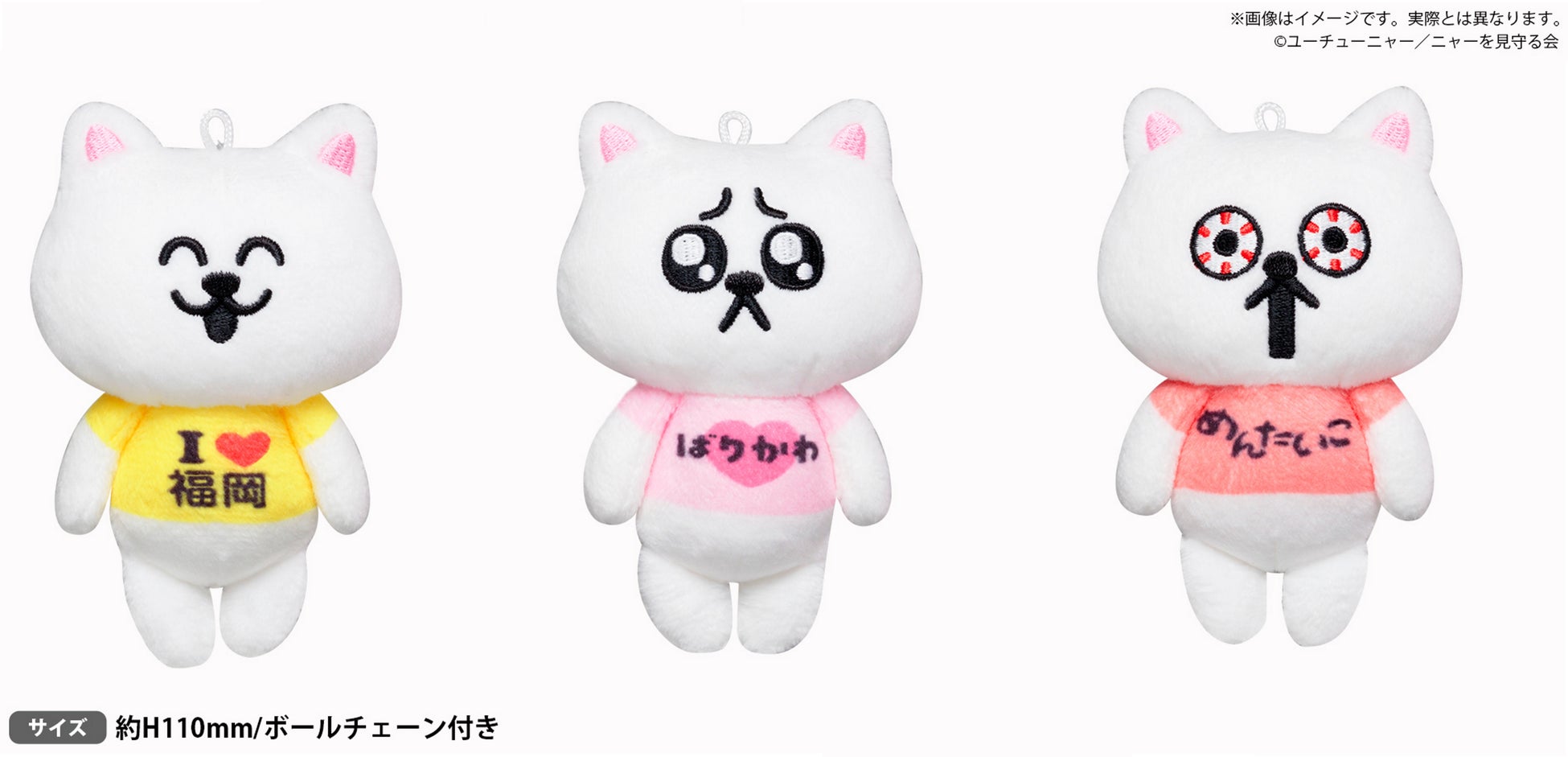 KBC九州朝日放送「アサデス。KBC」内で放映のTVアニメ『ユーチューニャー』のぬいぐるみマスコット第二弾が、九州北部地方限定でモーリーファンタジー等に登場します。『ユーチューニャー』に登場する動画チャンネル配信ネコの「ニャー」が、かばんなどにつけて一緒に連れて歩ける手のひらサイズのマスコットぬいぐるみになりました。「I♡福岡」「ばりかわ」、「めんたいこ」の九州のご当地Tシャツを着た表情豊かな「ニャー」のぬいぐるみマスコット全3種類を展開いたします。