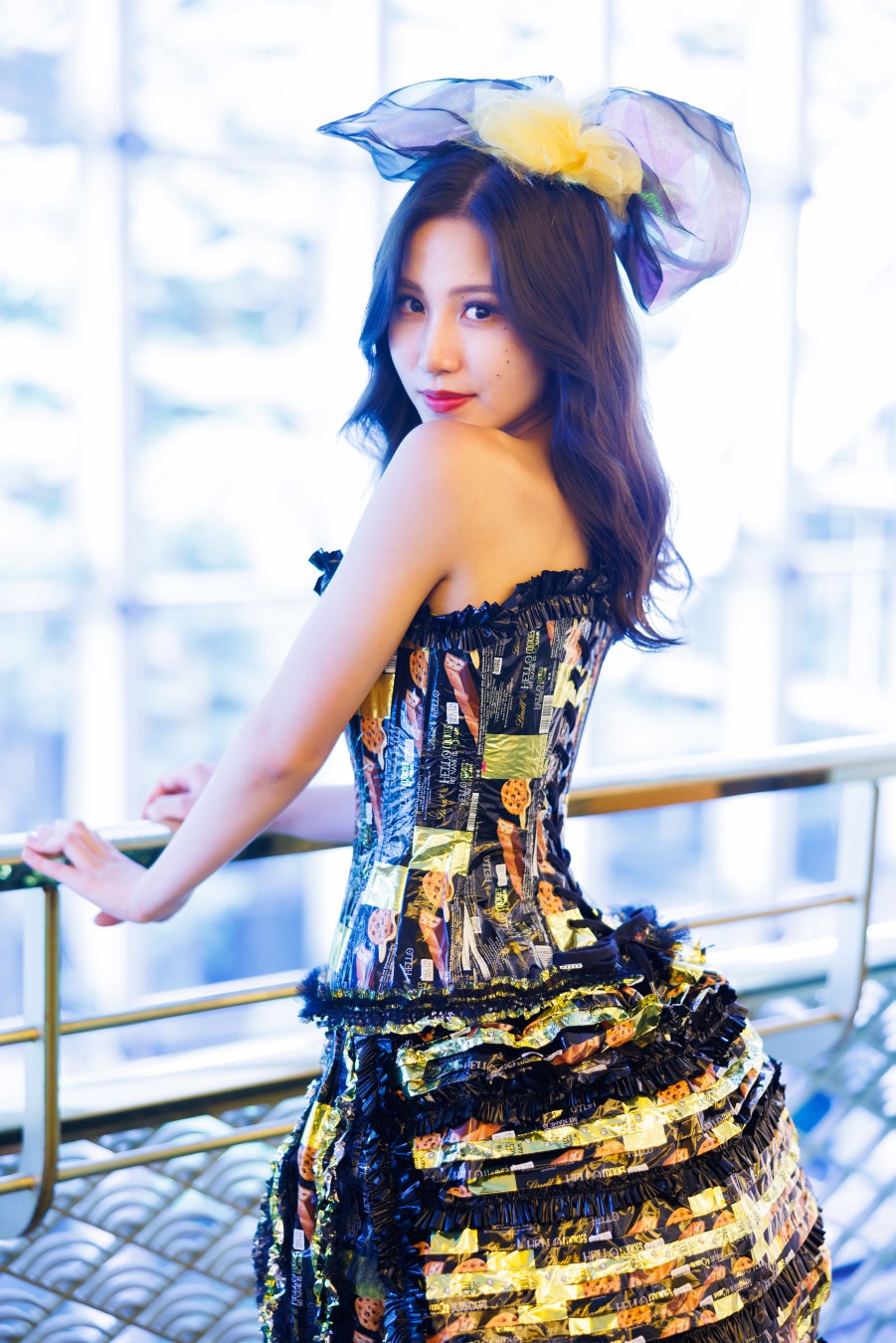 ファッションブランド「リ・サイクル・スタイル」のチョコレートの包み紙で作られたドレス着用。材料で使われたチョコレートを来場者へ配った