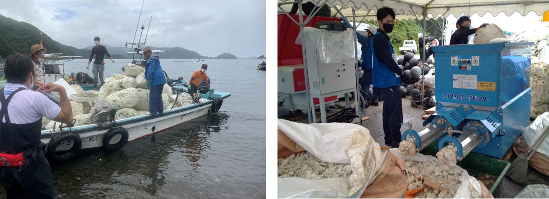 瀬戸内オーシャンズX推進協議会は、地元のボランティア団体や自治会、郵便局員や漁業者、学生、行政などと協力し、人の立ち入りが難しい海岸に散乱する、フロートやブイなど大型の漁業系ごみを効率的に一掃するため、減容装置を用いた実証事業を実施いたしました。このイベントは、日本財団が推進する海洋ごみ対策事業「海と日本プロジェクト・CHANGE FOR THE BLUE」の一環で開催しました。