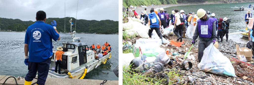 漁港の荷上場から清掃場所の海岸まで船で上陸し、堆積した漂着ごみをみんなで回収。今回の回収量はなんと合計約1トン!ペットボトルや包装などの生活系ごみが約580㎏、漁具のプラスチック製のブイが約600㎏(約450個)も集まりました。参加した漁業者の方に伺うと、こうした漁具などの漂流・漂着ごみは、日頃から見つけたら引き上げているが、処理には費用が掛かるうえ保管スペースも限られ、どんどん溜まってしまい困っているとのことでした。