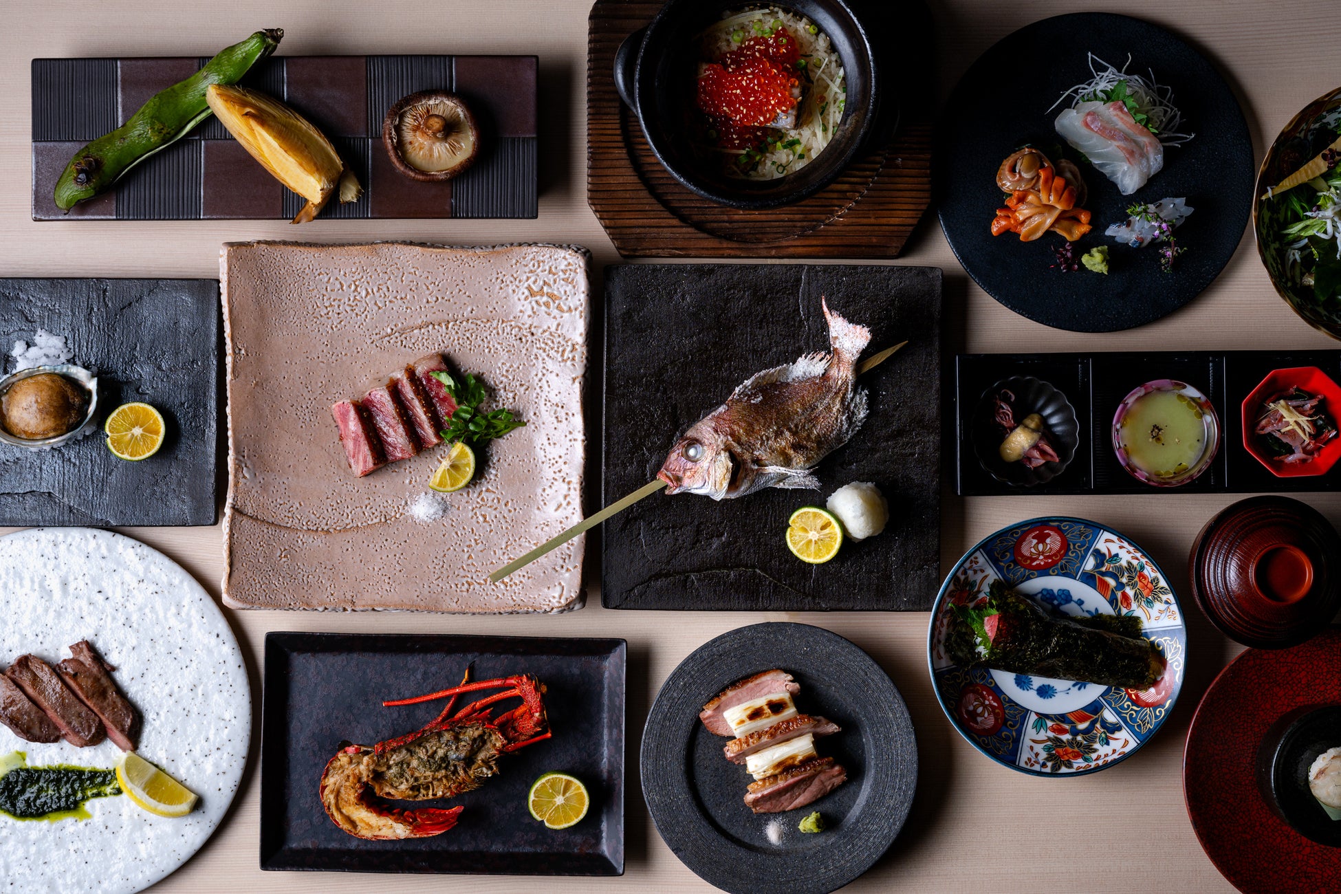目の前で調理される炉端料理に舌鼓。季節の魚介、厚切り牛タン、和牛ロースの炭火焼きなど15品も登場する少量多品目の限定コースをご用意