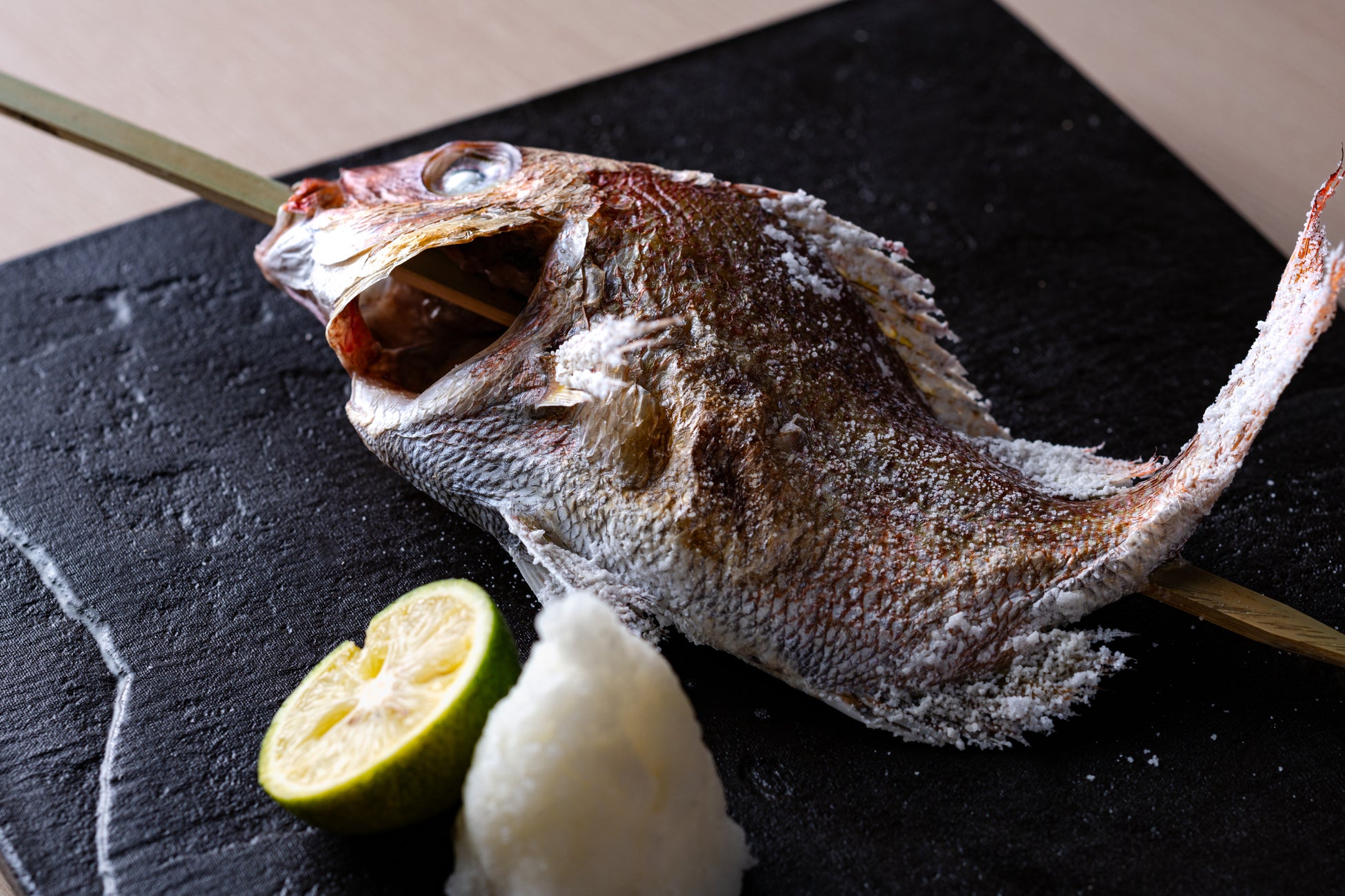 職人の手で丁寧に焼き上げる「鯛の原子焼き」。その最大の特徴は、火との絶妙な距離感。遠過ぎず、近過ぎず、細やかに調整しながらじっくりと焼くことで、余分な脂が落ち、旨みが凝縮されます。さらに、魚を逆さに立てて焼くことで、脂が表面を流れ、外はパリッと香ばしく、中はふっくらジューシーな仕上がりに。