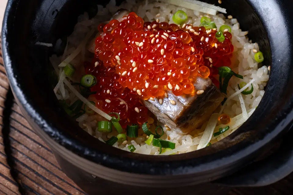厳選した米を土鍋でじっくりと炊き上げたあと、国産サーモンといくらを散らして完成。
