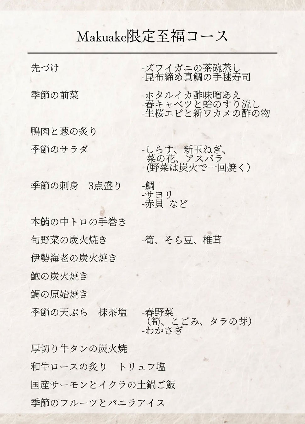 (1)2回目以降の来店時もMakuake限定至福コースを9,000円でご注文いただける権利