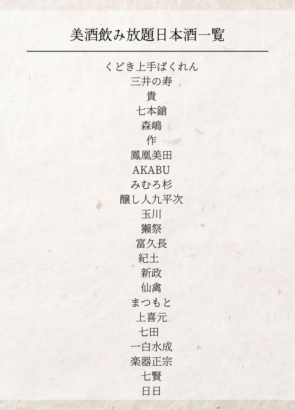 新政、獺祭、作、醸し人九平次など、希少な銘柄も含み、飲み放題となっております。