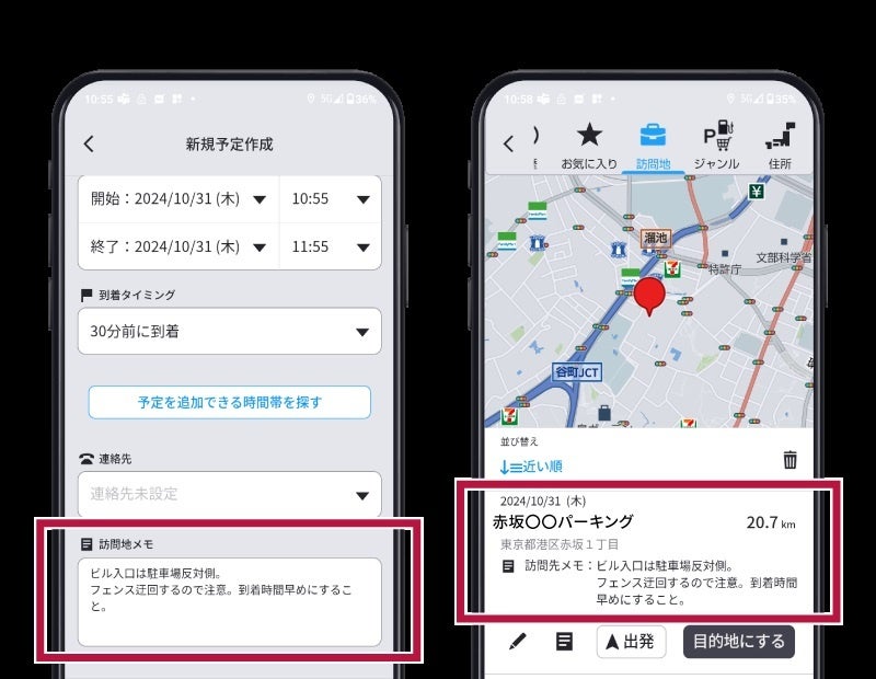◇作成した訪問スケジュールの出発10分前にポップアップで通知するほか、思わぬ渋滞などでアポイント時間に遅れそうな時には、遅延の可能性を画面に表示します。また、訪問先周辺の道路状況、施設の入り口、駐車場所など、次回訪問する際に気を付けておきたいことを、訪問先ごとにテキストで書き込めます。