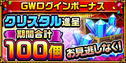 クリスタルが合計100個手に入るログインボーナスや、GW毎週無料10連召喚、人結晶・人輝晶・人幻晶が日替わりで手に入るGWスペシャルミッションを開催いたします。