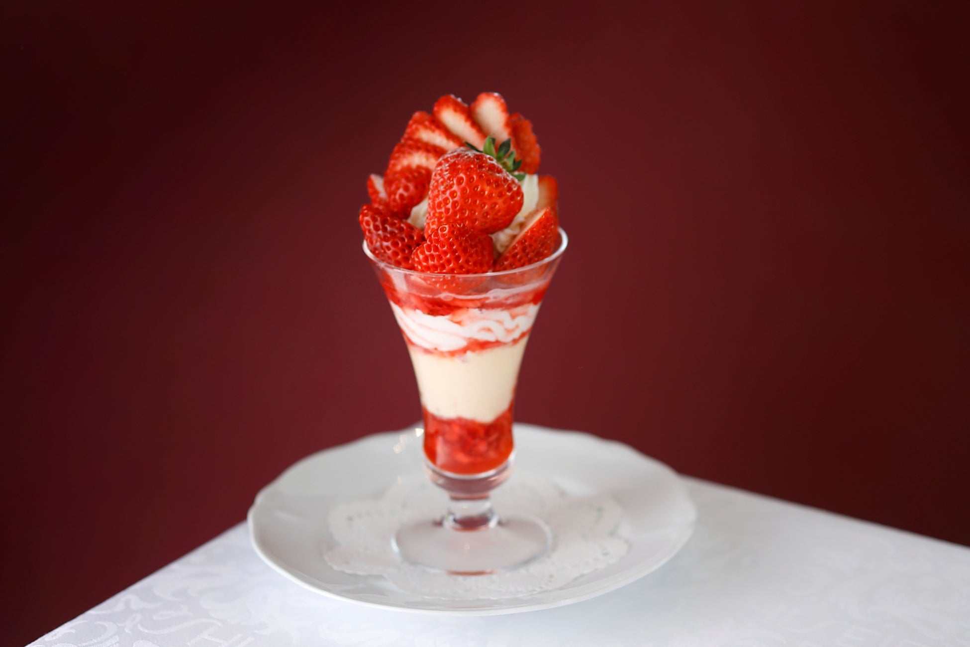 大粒で糖度が高く、強い甘味とほどよい酸味が調和した苺「あまえくぼ」。その芳醇な香りも生かし、パフェに仕立てました。