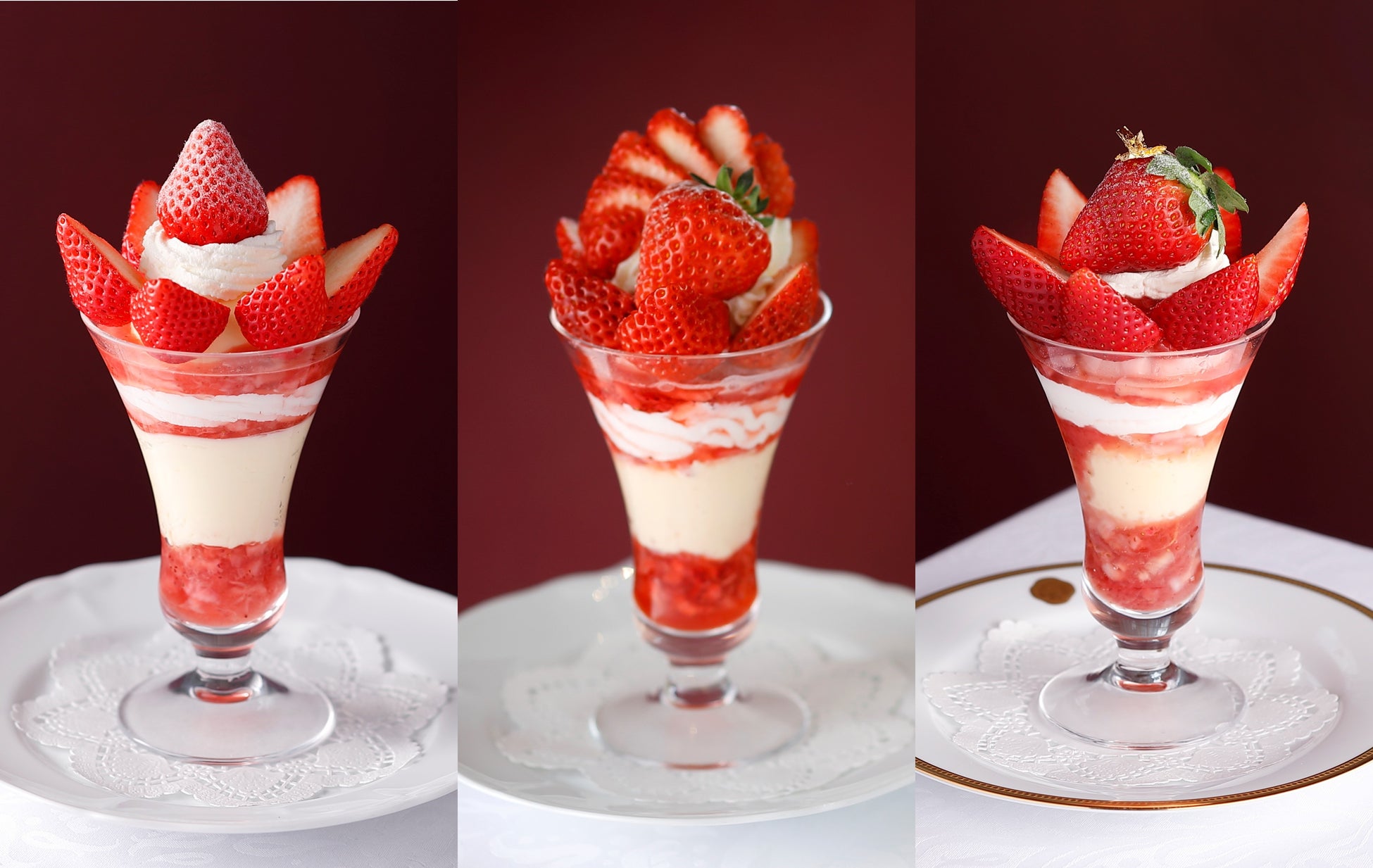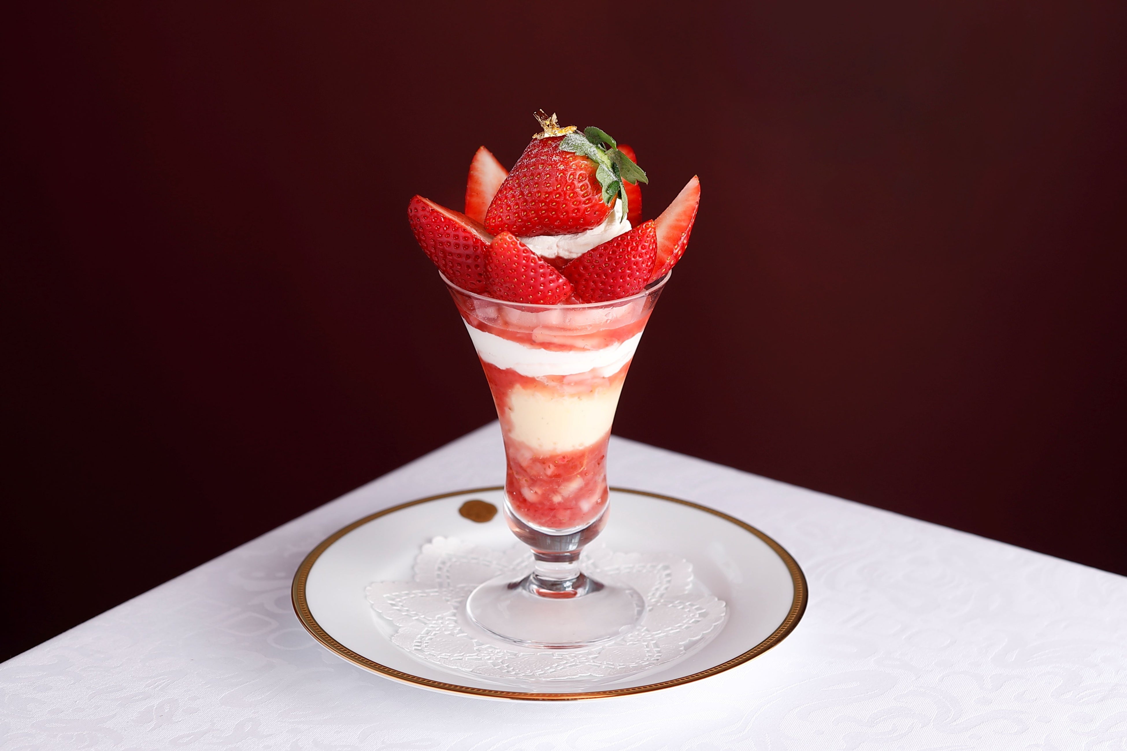 2種の苺を贅沢に使い、華やかなパフェに仕立てました。グラスから広がる苺の杏仁豆腐やソースと、バニラ・ストロベリー・ミルクの3種の自家製アイスクリームとのハーモニーをお楽しみください。