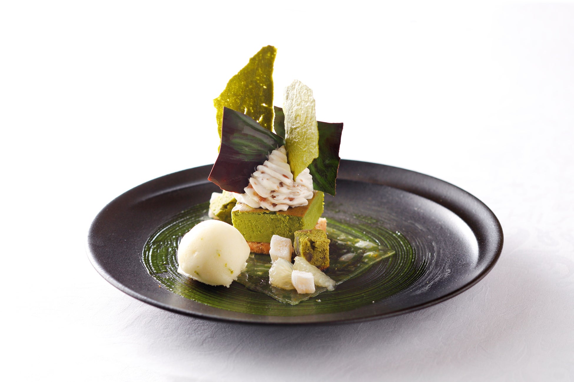 「宇治抹茶のチーズケーキ 柑橘の香りのシャーベットとともに」