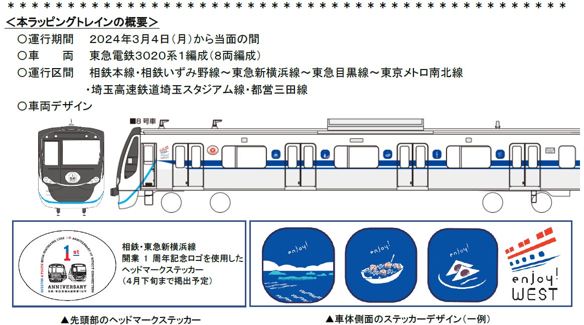 本ラッピングトレインの運行は、相鉄・東急新横浜線の開業1周年を記念して、「西日本へのお楽しみは、新横浜から。」をキャッチコピーに東急電鉄が取り組む「enjoy WEST」プロモーションの一環として行います。JR東海の全面協力により、新幹線と同じブルーのラインを2本施すほか、西日本の各エリアを想起させるステッカーと、「enjoy WEST」プロモーションのキャンペーンステッカーを貼付します。さらに車両の両先頭部には相鉄・東急新横浜線の開業1周年を記念し、相模鉄道株式会社(以下、相鉄)と共同で制定したロゴのヘッドマークステッカーを掲出します。
