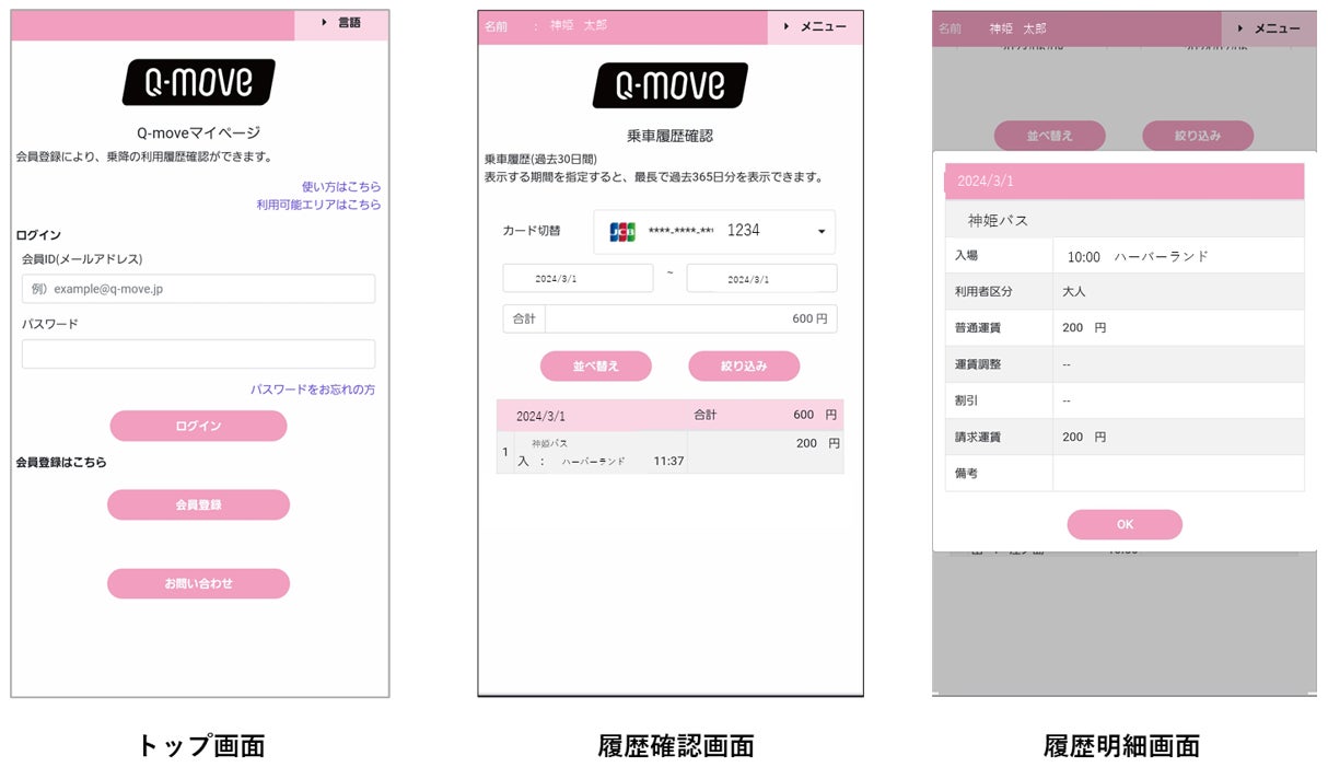 QUADRACのQ-moveサイトにアクセスし、「マイページ」の会員登録手続きが完了すると、タッチ決済の利用履歴を確認することができます。