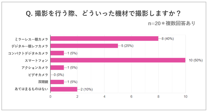 撮影機材は一眼レフ/ミラーレスとスマホで二極化しており、スマートフォンの手軽さや一眼カメラの画質の良さなど、ひとりひとりの撮影スタイル・シーンにあわせた撮影機器を選定していることが伺えます。