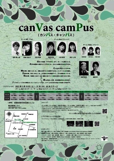 ブイラボミュージカル(代表:滝井サトル)主催、『canvas campus』(カンバス・キャンパス)が2022年3月19日(土)〜31日(木)に音響芸術専門学校「別館ライブQ」(東京都港区)にて上演されます。チケットはカンフェティ(運営:ロングランプランニング株式会社、東京都新宿区、代表取締役:榑松 大剛)にて2月17日(木)20:00より発売開始です。
