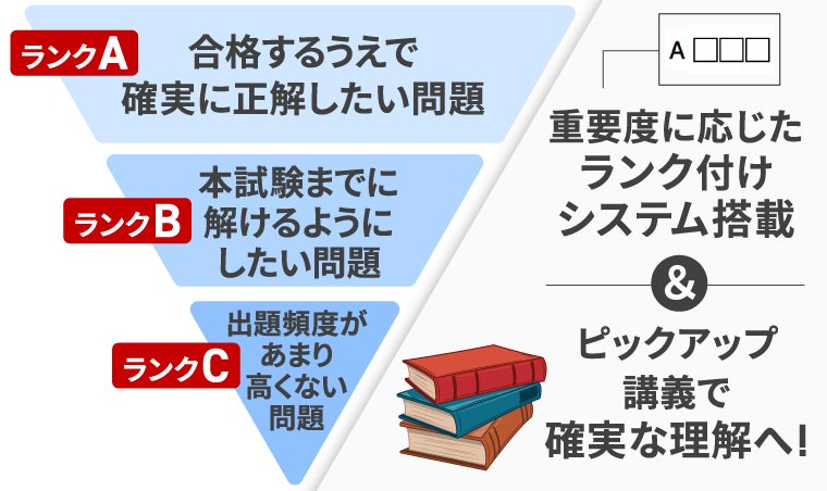 10年分の過去問を重要度に応じてA~Cにランク付けされた過去問集が付属します。そのため優先順位をつけて効率的に学習を進めることができます。過去問から厳選した問題についてはピックアップして講義で解説するため、解くだけではなく、しっかりと知識を身に付けることができます。