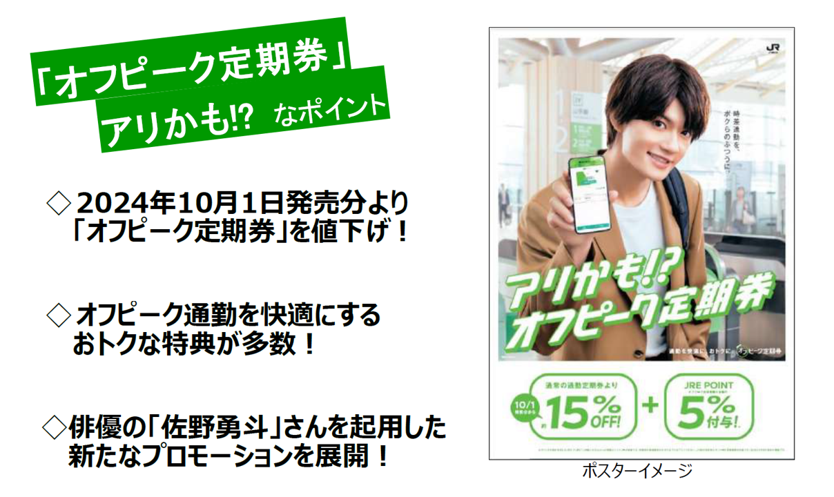 ○JR東日本では、平日朝の通勤時間帯の混雑緩和を目的として、2023年3月18日から通常の通勤定期券より割安な「オフピーク定期券」サービスを開始しています。 ○更に多くのお客さまにご利用いただけるよう、2024年10月1日発売分より「オフピーク定期券」を通常の通勤定期券より約15%割安な価格に値下げします。また、俳優の「佐野勇斗」さんを起用し、「アリかも!?オフピーク定期券」をキャッチコピーとした新たなプロモーションを行います。 |