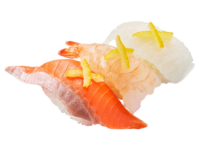 かっぱ寿司の人気定番ネタを楽しめる一皿。脂がのった大切りサーモンと、甘み際立つ生えび、とろける旨みのえんがわを、塩と柚子でさっぱりとお召し上がりください。