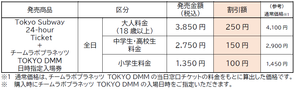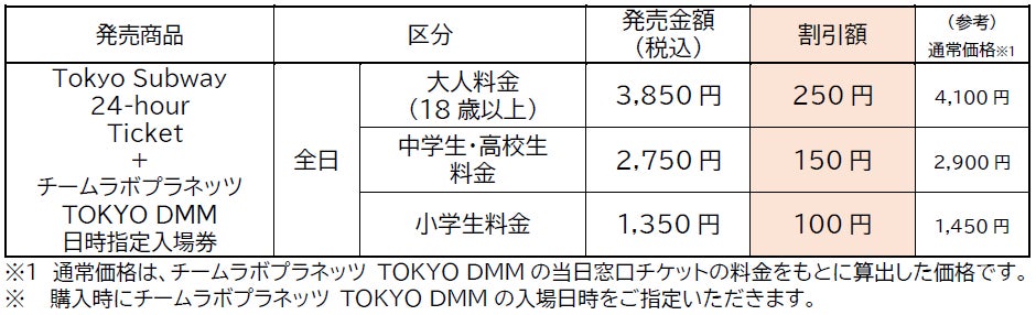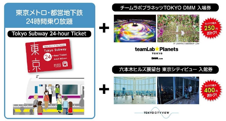 この度、観光施設との連携第3弾として、チームラボプラネッツ TOKYO DMM、六本木ヒルズ展望台 東京シティビューとタイアップし、それぞれの入場券と都内をお得に巡ることができるTokyo Subway 24-hour Ticketをセットで発売いたします。最大400円お得に、Tokyo Subway Ticketサイト等で便利にご購入いただけます。