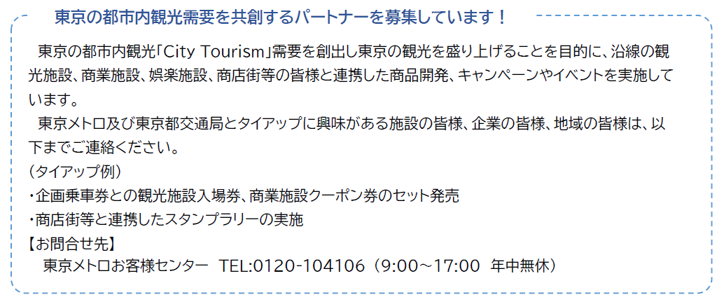 東京メトロでは、多くのお客様に東京の魅力に触れていただくことを目的に、観光施設等と連携し、東京の都市内観光「City Tourism」を楽しんでいただく取組みを推進するとともに、東京都交通局と共同で企画乗車券などを発売し、お客様の利便性向上に繋げる取組みを展開しています。