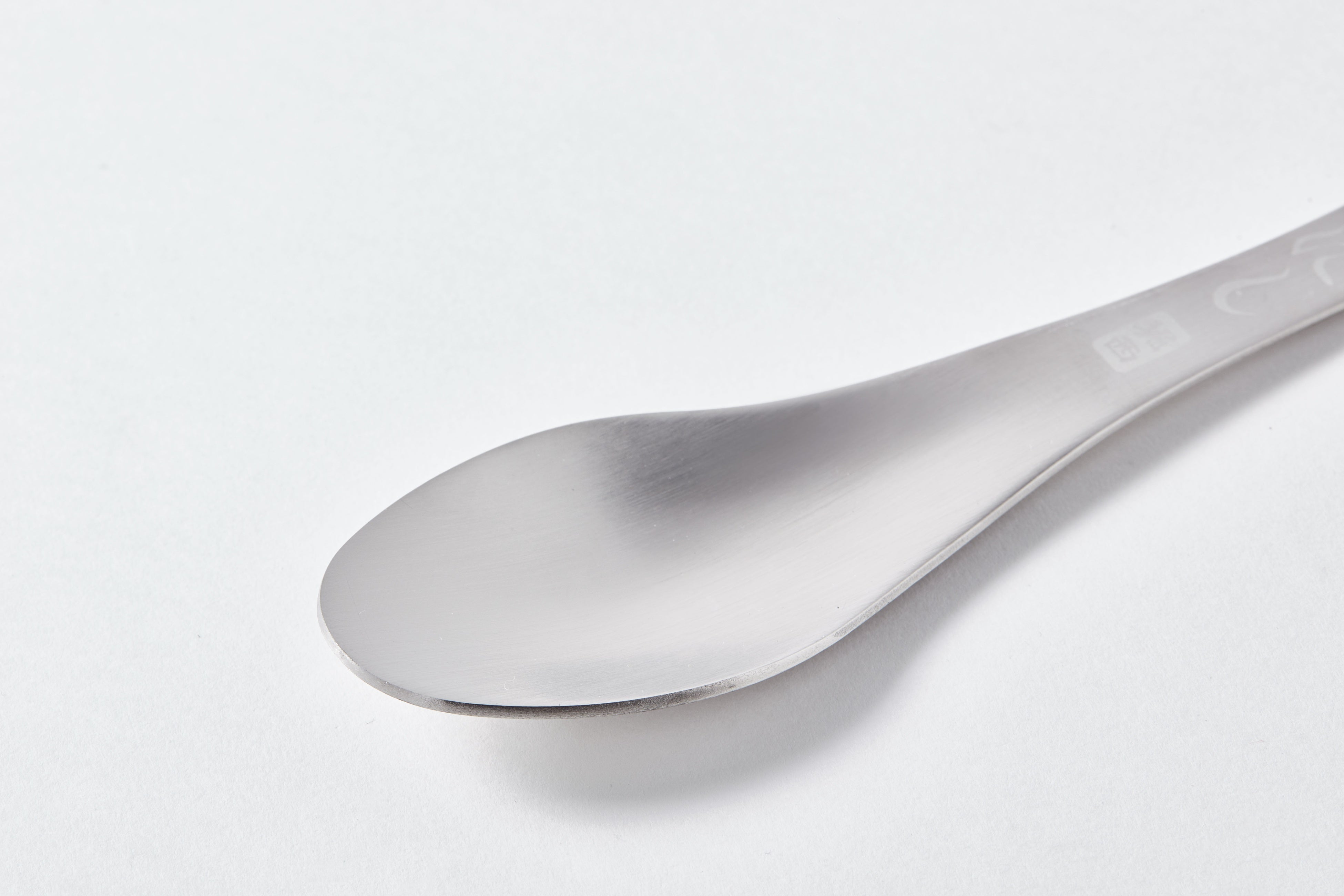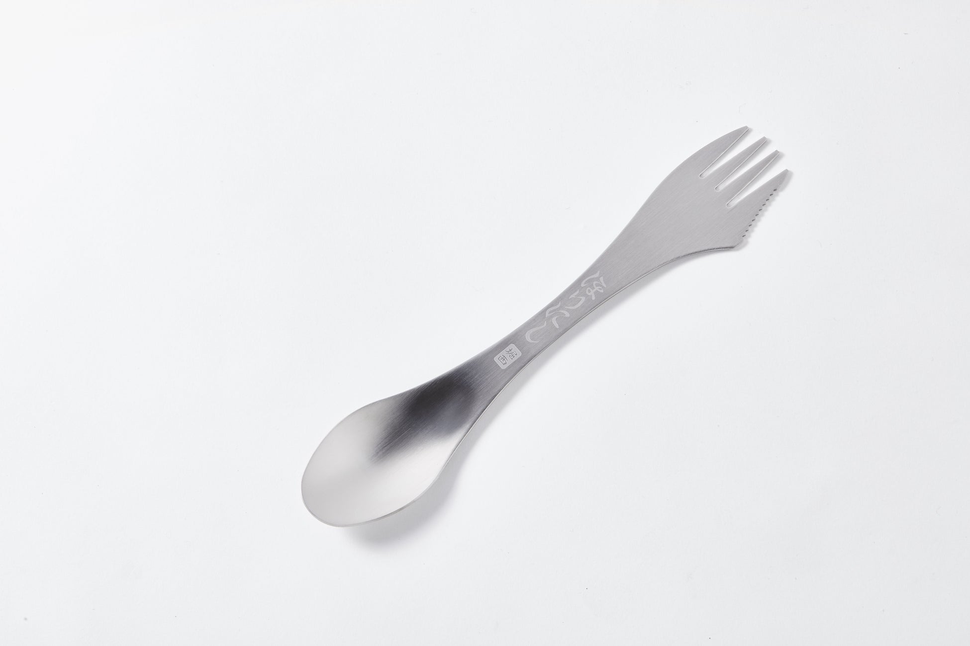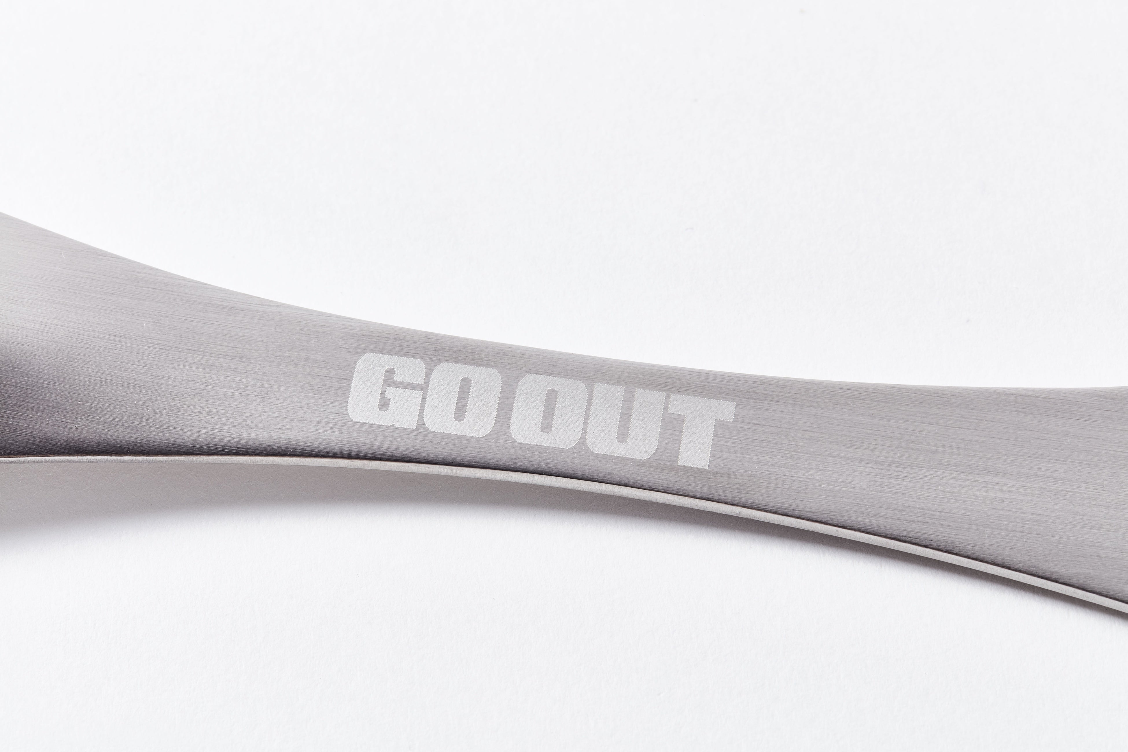 フラットな形状の4本歯のフォークは、側面のギザギザしている部分をナイフとして使用でき、 オモテ面には“ほりにし”のひらがなロゴと“堀西”のハンコ風ロゴを、ウラ面にはGO OUTのロゴを刻印。