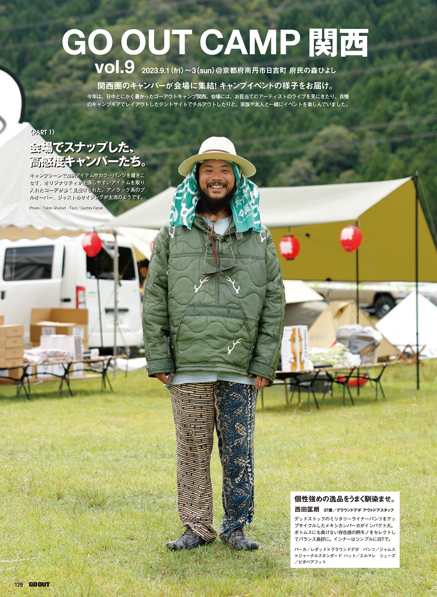 キャンプシーンで総柄アイテムやカラーパンツを履きこなす、オリジナリティが主張しやすいアイテムを取り入れたコーデが多く見受けられたゴーアウトキャンプ関西。アノラック系のプルオーバー、ジャストめサイジングが主流のようです。