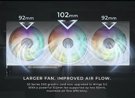102mm x1、92mm x2の大型3連ファンによる強力な風量・風圧でヒートシンクから効率的に放熱します。