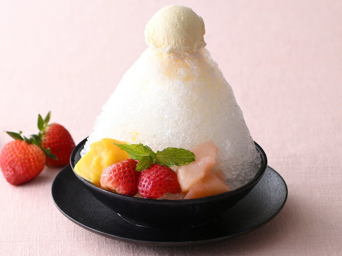 ふわふわ食感の氷に、いちごやマンゴーなどのフルーツをトッピング!