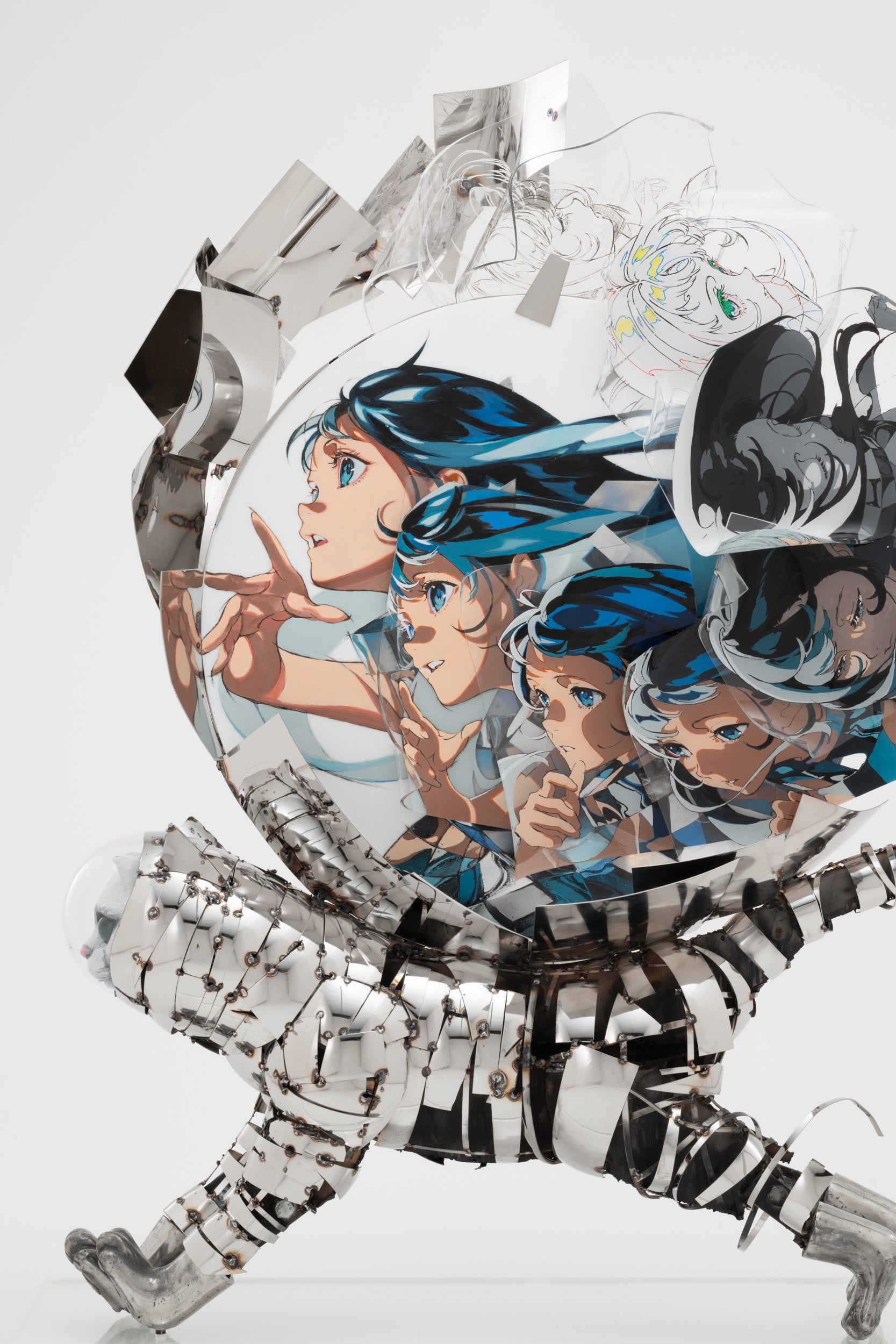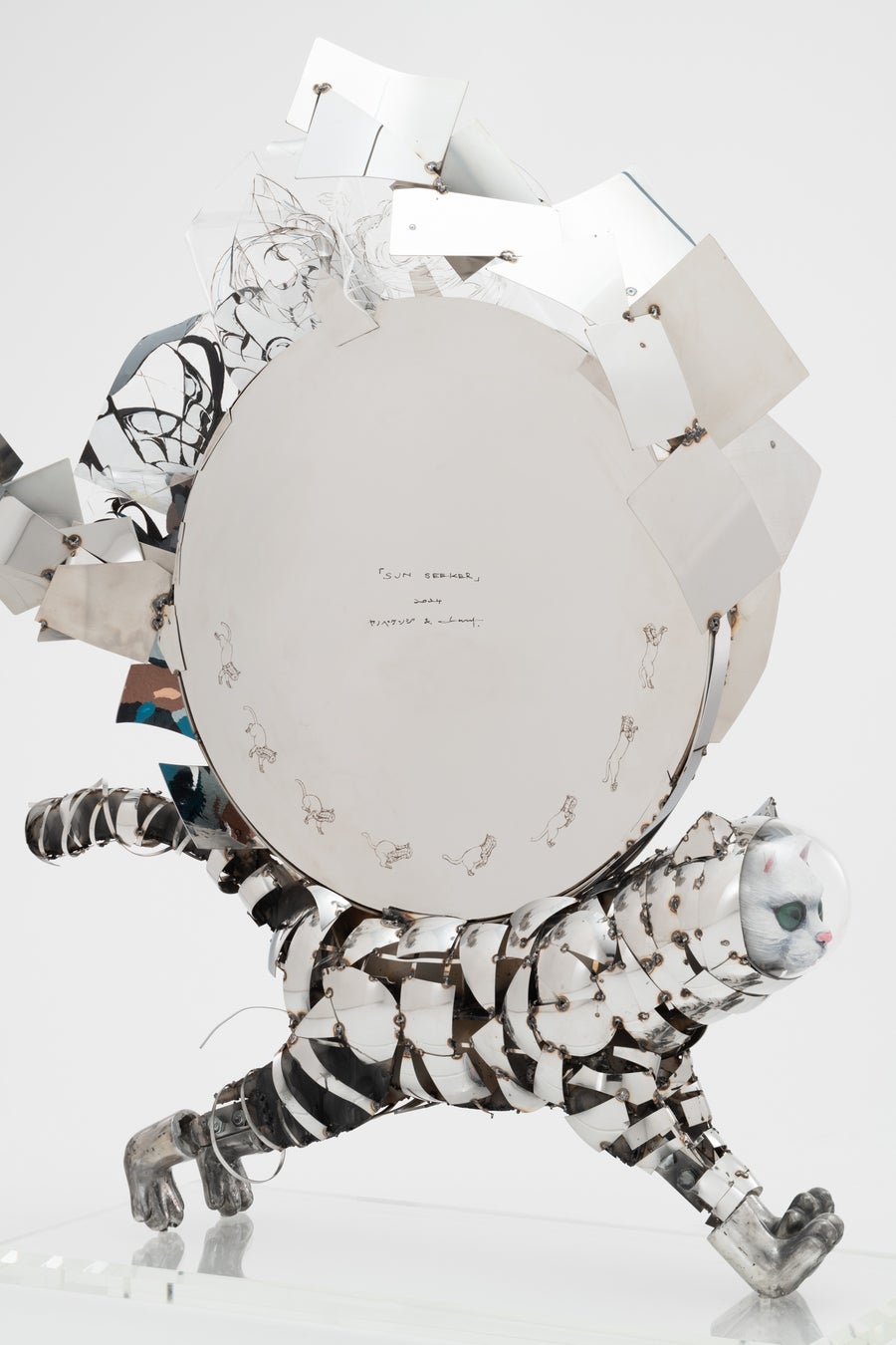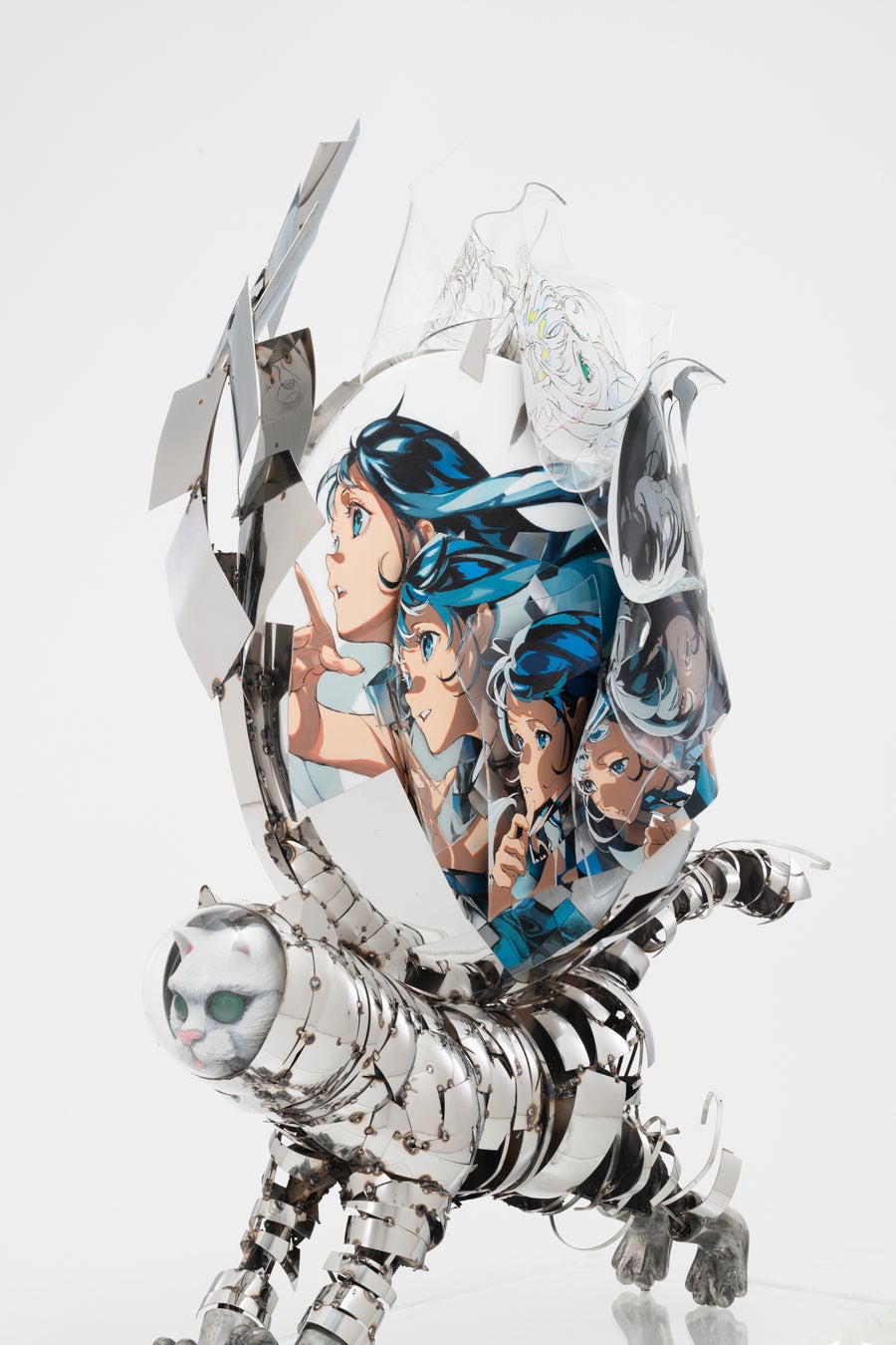 そのような米山の世界観とスケッチを元に、米山が変化するアニメーション、めくったセル画のように複数のアクリル板に「サン・シスター」の像を描き、それを支える猫を、ヤノベケンジが米山のタッチに合わせてステンレス片を接合して、彫刻に仕上げました。本作は、米山とヤノベの世界観や感性、技術が共振してできた新たな作品といえるでしょう。