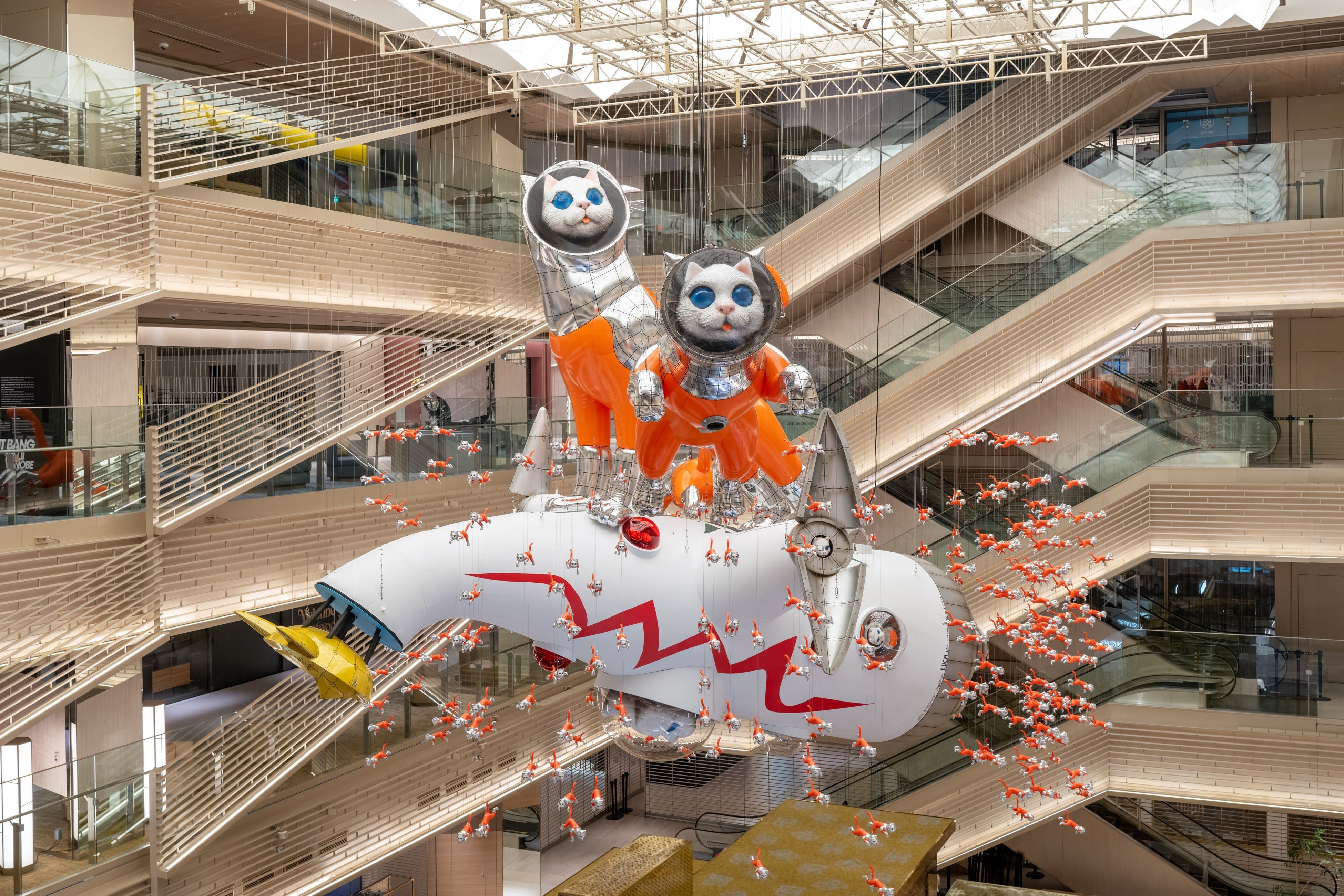 《SHIP‘S CAT》は、2017年からヤノベケンジが、古代から人間と共に旅をした「船乗り猫」をモチーフに、福を運ぶ旅の守り神として制作した猫の彫刻です。現在旅する人々に加え、未来ある若者のために、宇宙服や潜水服のようなスーツを着て人類の旅を見守っており、日本各地、世界各国で展示や恒久設置されています。