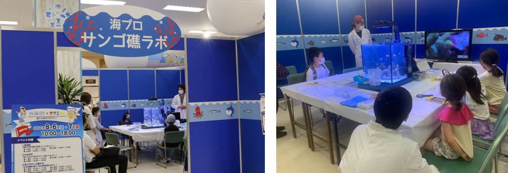 会場では、海やサザエさんにまつわる落語や海のポスター作成、サンゴ礁の海を再現した水槽使った講義など、海の環境問題を学ぶプログラムなどを実施。その他オリジナル「サザエさん」グッズの販売や、サザエさん(着ぐるみ)と写真が撮れるフォトコーナーでは多くの親子連れ、子どもたちに楽しんでいただきました。