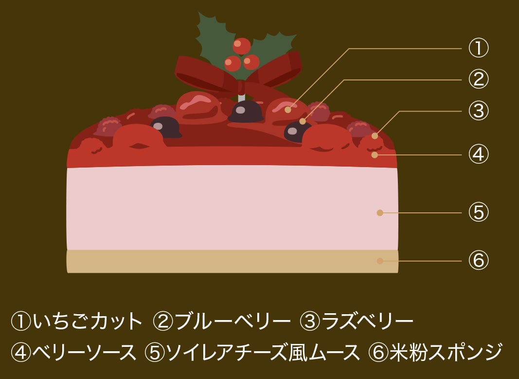 米粉スポンジに、いちごジャムの果肉を混ぜた豆乳由来の「ソイレアチーズ風ムース」を流しました。3種のベリーをクリスマスリースに見立てて飾り、ベリーソースをたっぷりかけた、甘酸っぱくさっぱりとしたケーキです。