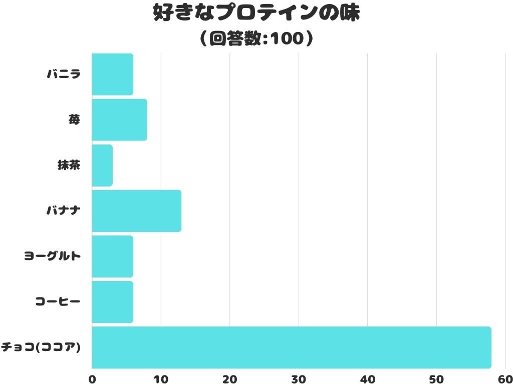 好きなプロテインの味をアンケートにて調査したところ、1位は「チョコ(ココア)」でした。