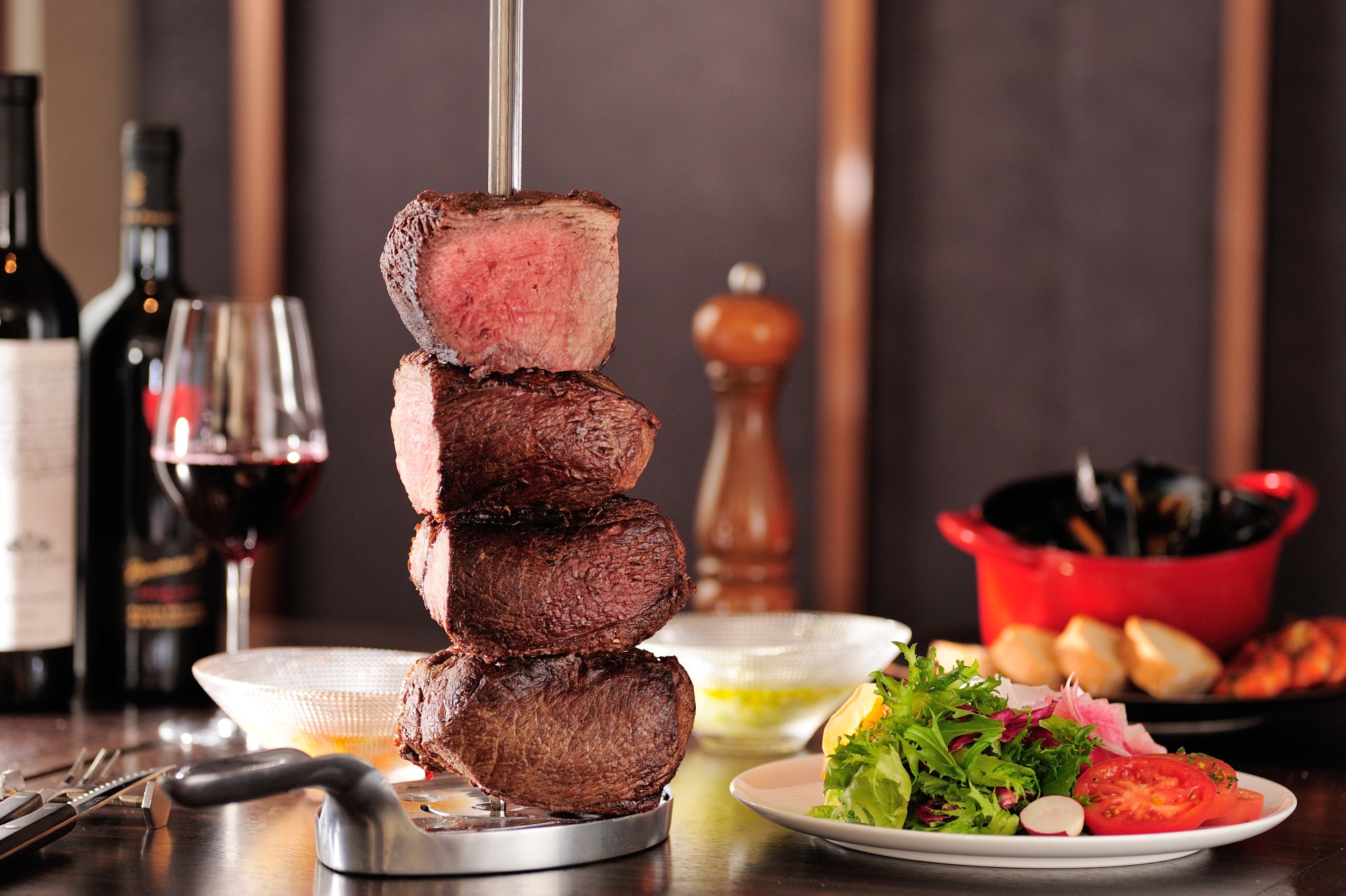 ブラジル伝統のBBQスタイル「シュラスコ」。牛肉の様々な部位やポーク、チキン、ソーセージなどを塩やガーリック、ハーブスパイスでなどで風味をつけじっくりローストして焼き上げます。塊のまま串刺しにしたお肉をテーブルまでお持ちし、シェフがお客様の目の前で切り分けます。