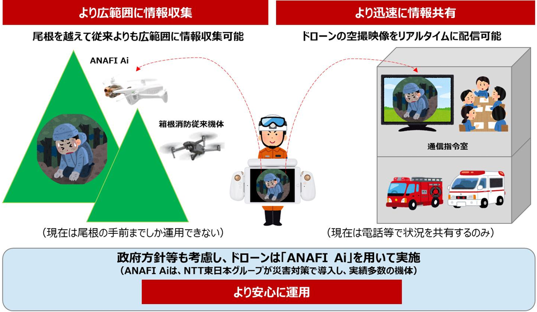以上のような課題は、箱根消防のみが抱える課題ではなく、全国の消防が抱えている共通の課題となっています。そこで、箱根消防と連携し、「NTT東日本グループにおける通信インフラの災害対策のために導入が進むドローン(以下、ANAFI Ai※2)」、並びにANAFI Aiに付随して利用可能な、令和6年能登半島地震等でもNTT東日本グループとして運用実績のあるリアルタイム映像配信等を用いて、箱根消防従来機体との比較検証を実施することになりました。