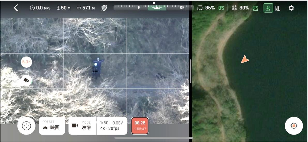 発見した要救助者を上空から撮影し、要救助者の状態並びに周辺環境を確認することができました。その際、ANAFI Aiから送信機へLTE経由で配信された映像を、遠隔地へリアルタイム配信できることも確認できました。