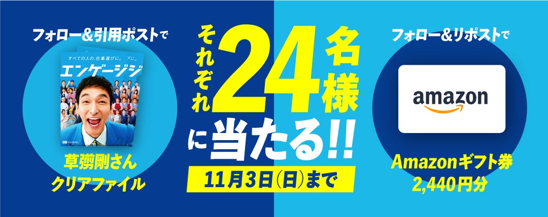 エン・ジャパン株式会社(本社:東京都新宿区、代表取締役社長:鈴木孝二)が運営する国内最大級の総合求人サイト『エンゲージ』(https://en-gage.net/)は、10月21日(月)より大型プロモーションを実施いたします。草彅剛さんが出演するCM第2弾「エンゲージのうた(業種)篇」の放映に加え、各種SNSでのWeb広告やデジタルサイネージといった交通広告も展開。さらに草彅剛さんのオリジナルクリアファイルやAmazonギフト券が当たるX(旧Twitter)キャンペーンも実施いたします。