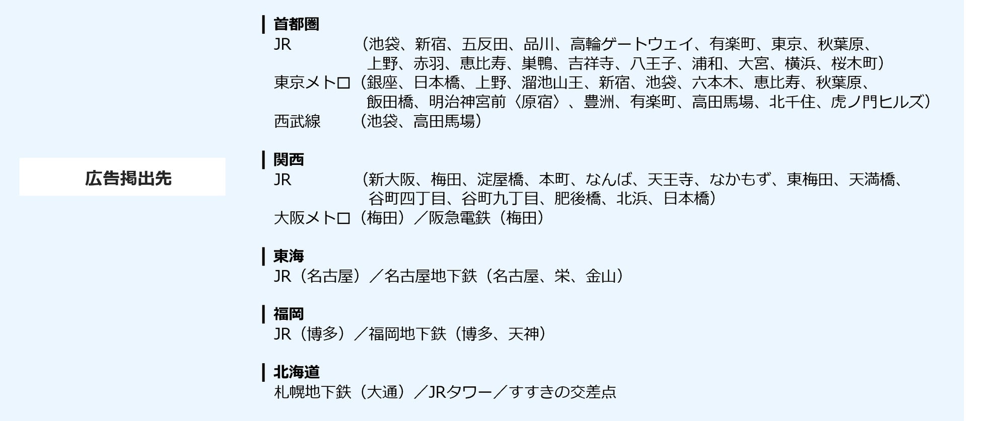 2024年10月21日(月)より順次、関東・中京・関西・福岡・北海道の駅で大型ボード、縦型サイネージなど1,000面以上の大規模展開を行ないます。また、JR東日本、東京メトロ、名古屋市営地下鉄、大阪メトロ、福岡市営地下鉄の全線にて電車内ステッカーも展開いたします。