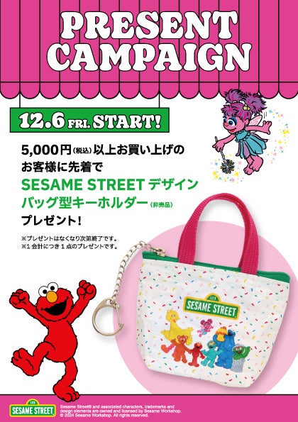 さらに、12月6日(金)からは5,000円(税込)以上お買い上げのお客様に先着で、「セサミストリートデザイン バッグ型キーホルダー」(非売品)をプレゼントする、ノベルティキャンペーンを実施!また、セサミストリートデザインのショッピングバッグ(20円(税込))も限定で登場します。詳細はプロモーション特設ページをご確認ください。