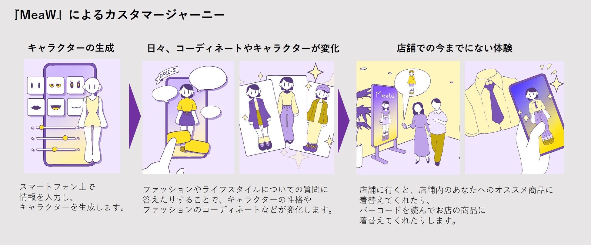 『MeaW』は、いくつかの質問回答によりユーザーの価値観や趣味などの情報を受け継いだキャラクターを生成することができ、そのキャラクターと日々コミュニケーションをとることでユーザーの個性を活かしたおすすめ商品を提案してくれる購買サポートサービスです。