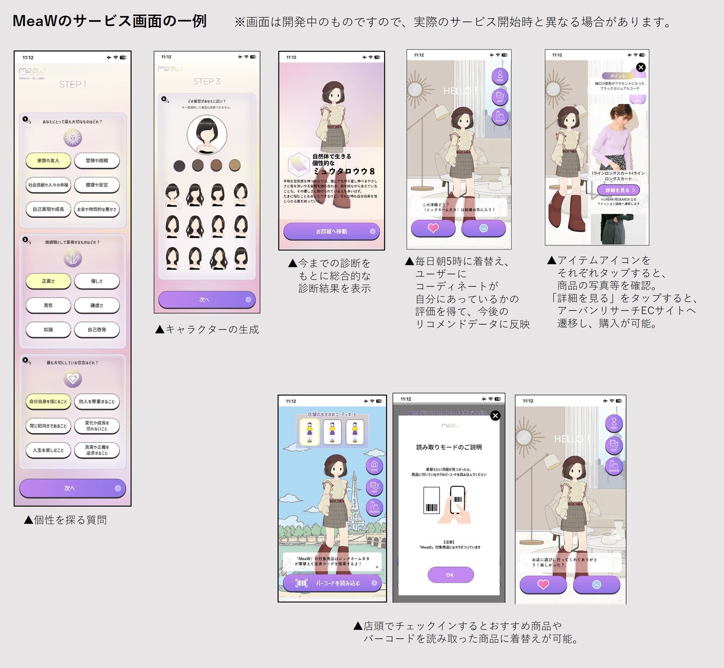 結果をもとにスマートフォンの中で生活するキャラクターがユーザー一人一人に特化したコーディネートを提案。提案商品はECサイトや店頭で購入することができ、普段気づかなかった新しい「私」に出会うきっかけを与えてくれます。