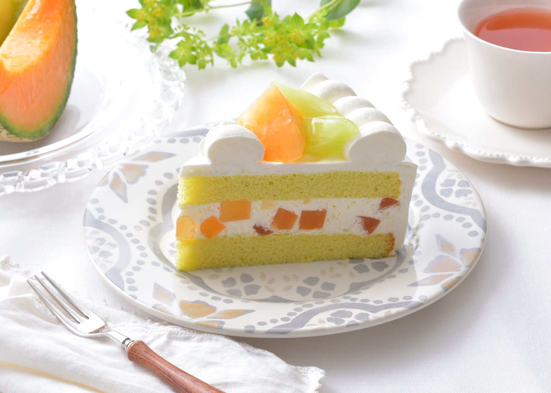 爽やかな甘みの“青肉メロン”とコクのある甘みの“赤肉メロン”を飾った季節限定のショートケーキ。メロンゼリーとカスタード入り練乳クリームを、メロン風味スポンジでサンドしました。ジューシーな2種のメロンとクリームが相性抜群です。