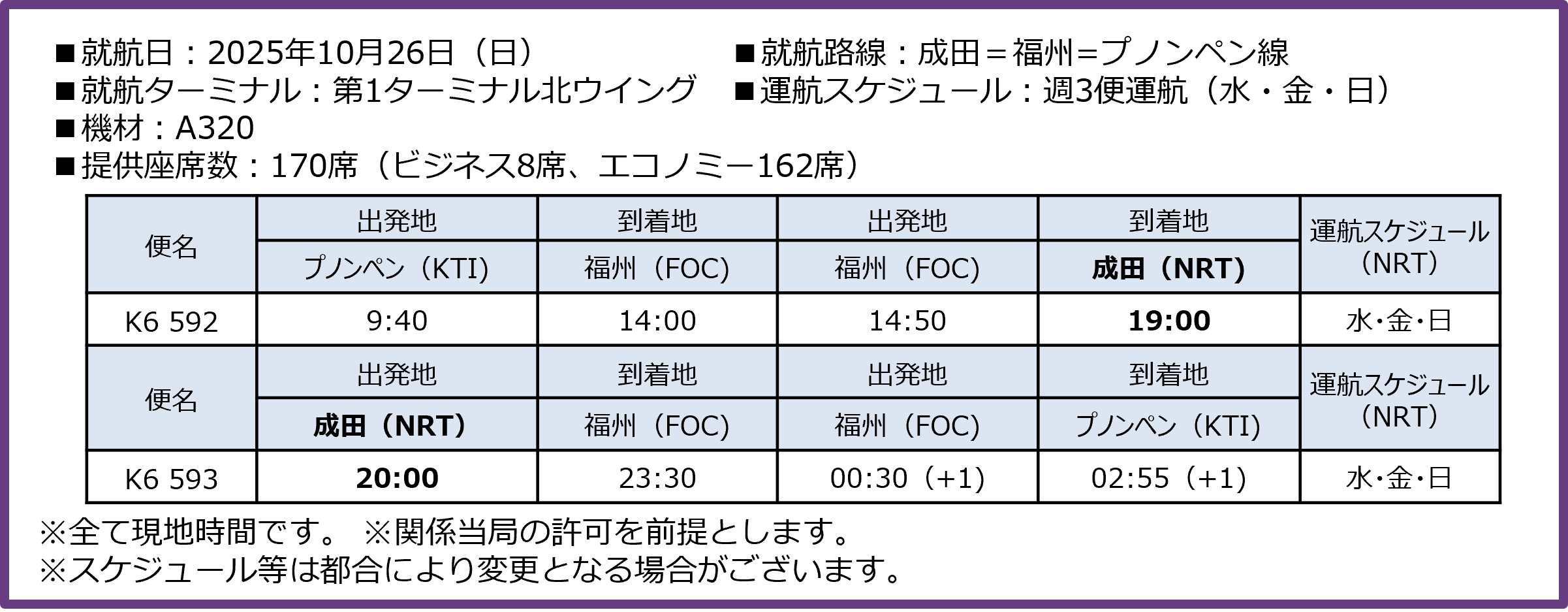 エア・カンボジア(IATAコード:K6)は、2025年10月26日より、中国・福州経由で成田ープノンペン(カンボジア)線を開設します。カンボジアのナショナルフラッグキャリアである同社は両国間を結ぶ唯一の航空会社となります。