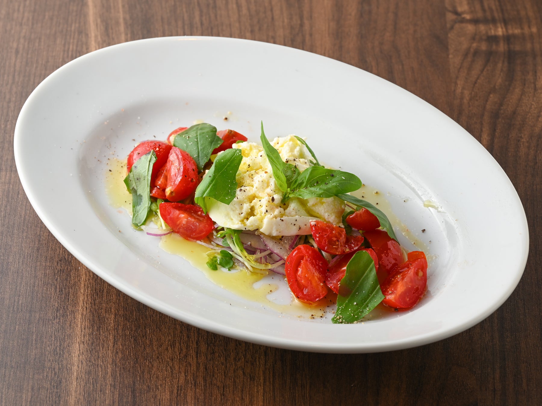 フレッシュな生モッツァレラを贅沢に使用した、シンプルながら奥深い味わいのカプレーゼ。ジューシーで酸味と甘みのバランスが絶妙なミニトマトが、チーズのコクを引き立てます。
