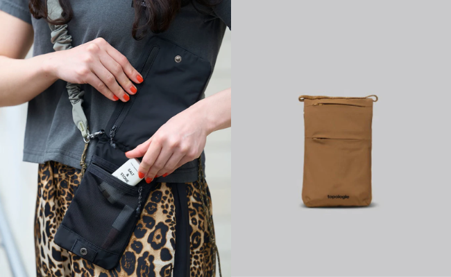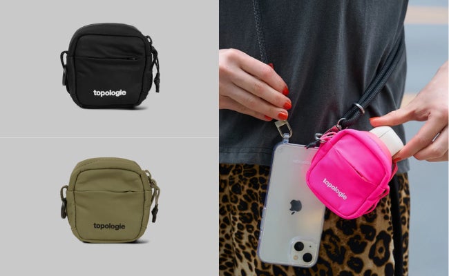タンブラーボトルと、スマートフォンやキー、財布などの持ち物も含めて便利に収納・持ち運びするためのサスティナブルなポーチです。