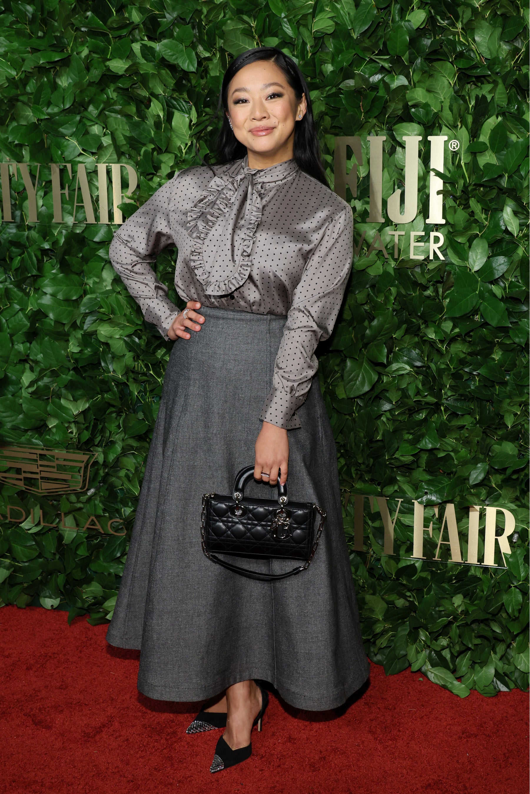 女優のステファニー・スーは、2023年クルーズ コレクションより、グレーシルクのプリントシャツにグレーウールのスカート、「レディ D-Joy」バッグを合わせた装いを披露。